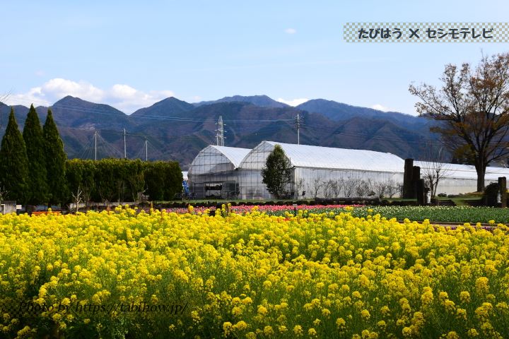 写真 ハーブ庭園旅日記でチューリップを背景に少しだけ咲く菜の花山梨県では「山梨県酪農試験場」の菜の花が絶景です。