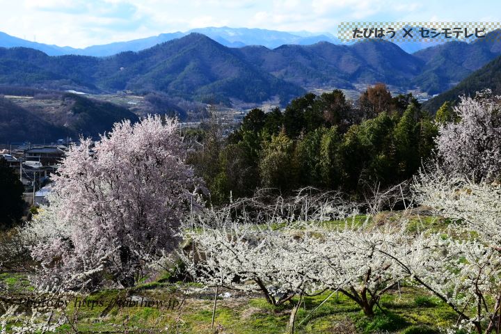 写真 塩山桃源郷で農道から見渡す桃畑の花に桜と山並みも映える山梨県の春を代表する花といえば、桃源郷と呼ばれる一面ピンクに彩られる桃の花。桃の栽培農家が多い山梨県にて、御坂町を筆頭に色々な桃スポットがあります。